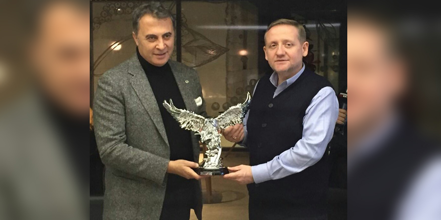 Göksel Gümüşdağ, Başkan Orman’a yeni stat için nazar boncuğu hediye ederken, Beşiktaş Başkanı da mevkidaşına kartal heykeli hediye etti.