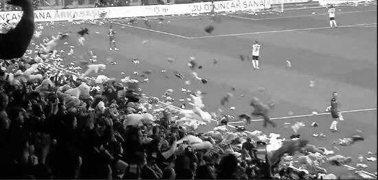 Depremin gerçekleşti saat olan 4.17. dakikada taraftarlar depremzede çocuklar için sahaya oyuncak attı.