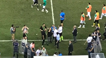 Kaeşılaşma sonrası maç anında olduğu gibi sahaya yabancı maddeler atıldı. Maç biter bitmez tribünlerden atılan su şişesi Şenol Güneş’in başını sıyırdı. Şenol hoca 4. Hakeme ve Samet Aybaba’ya bu durumu söyledi.